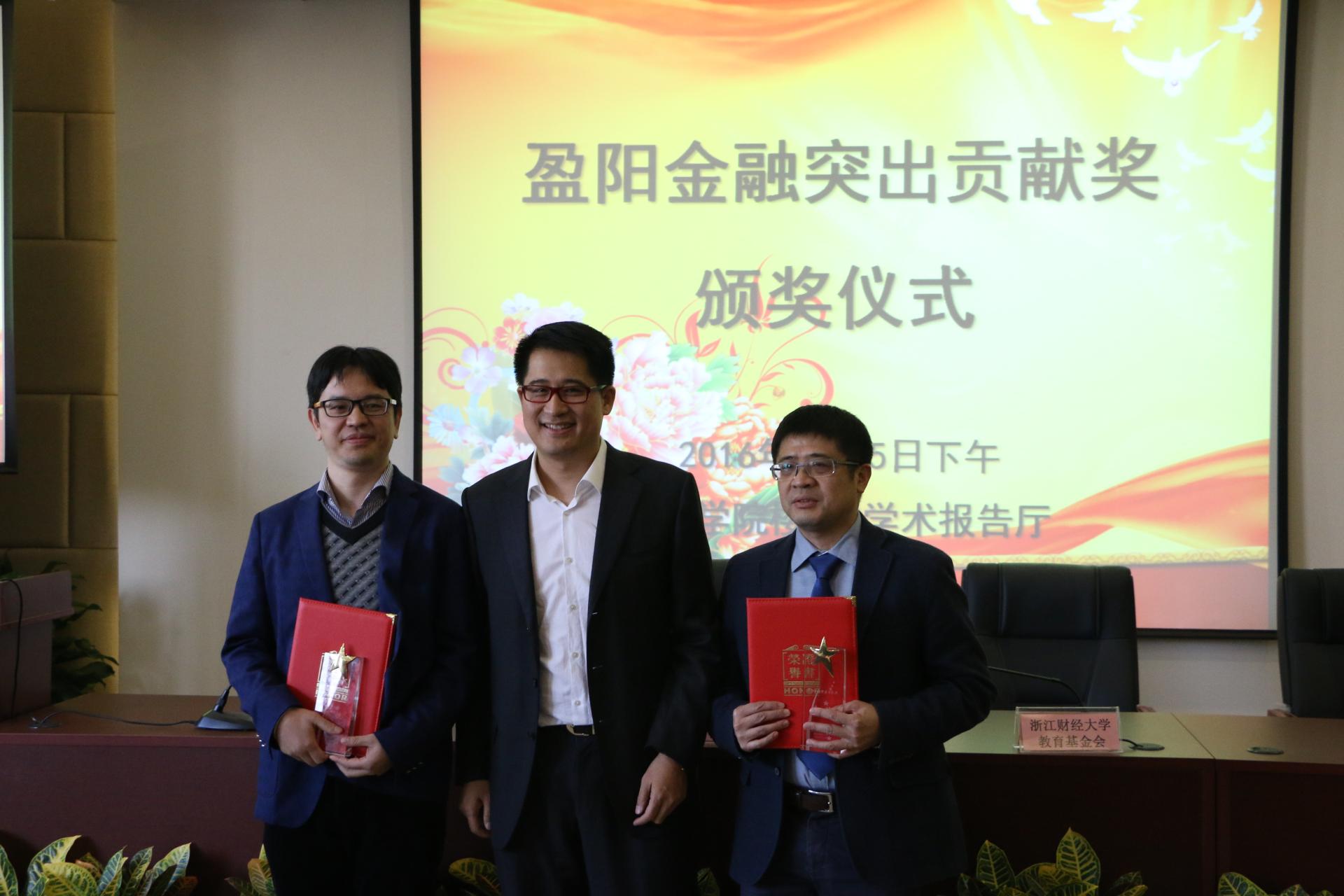 随后举行了盈阳金融突出贡献奖颁奖仪式,陈荣达教授与胡旭阳教授获得盈阳金融突出贡献奖金奖。浙江盈阳资产管理股份有限公司创始人楼栋先生为他们颁奖,并合影留念。最后,胡旭阳教授上台发言,他通过形象生动的语言,结合自己的亲身经历,介绍了公司所获得的成就,感谢并祝福了母校和员工会,送上了真挚的祝福与美好的期望。