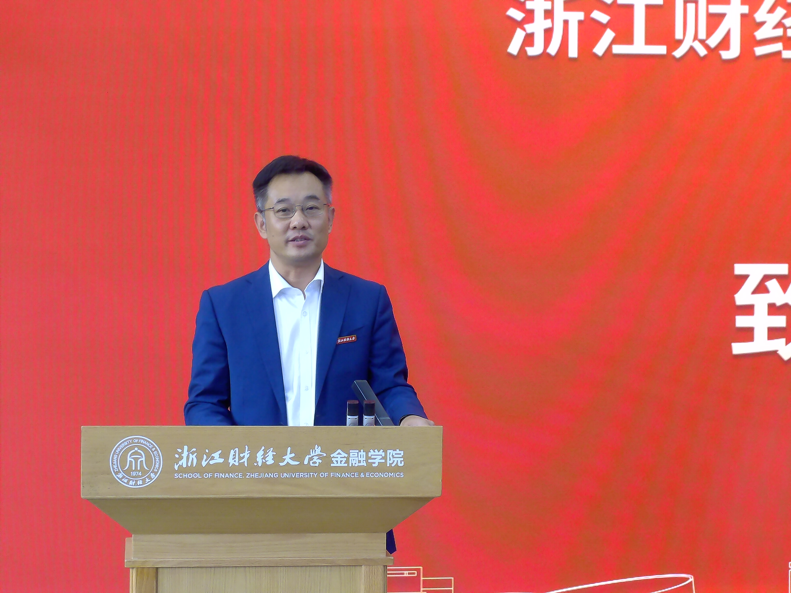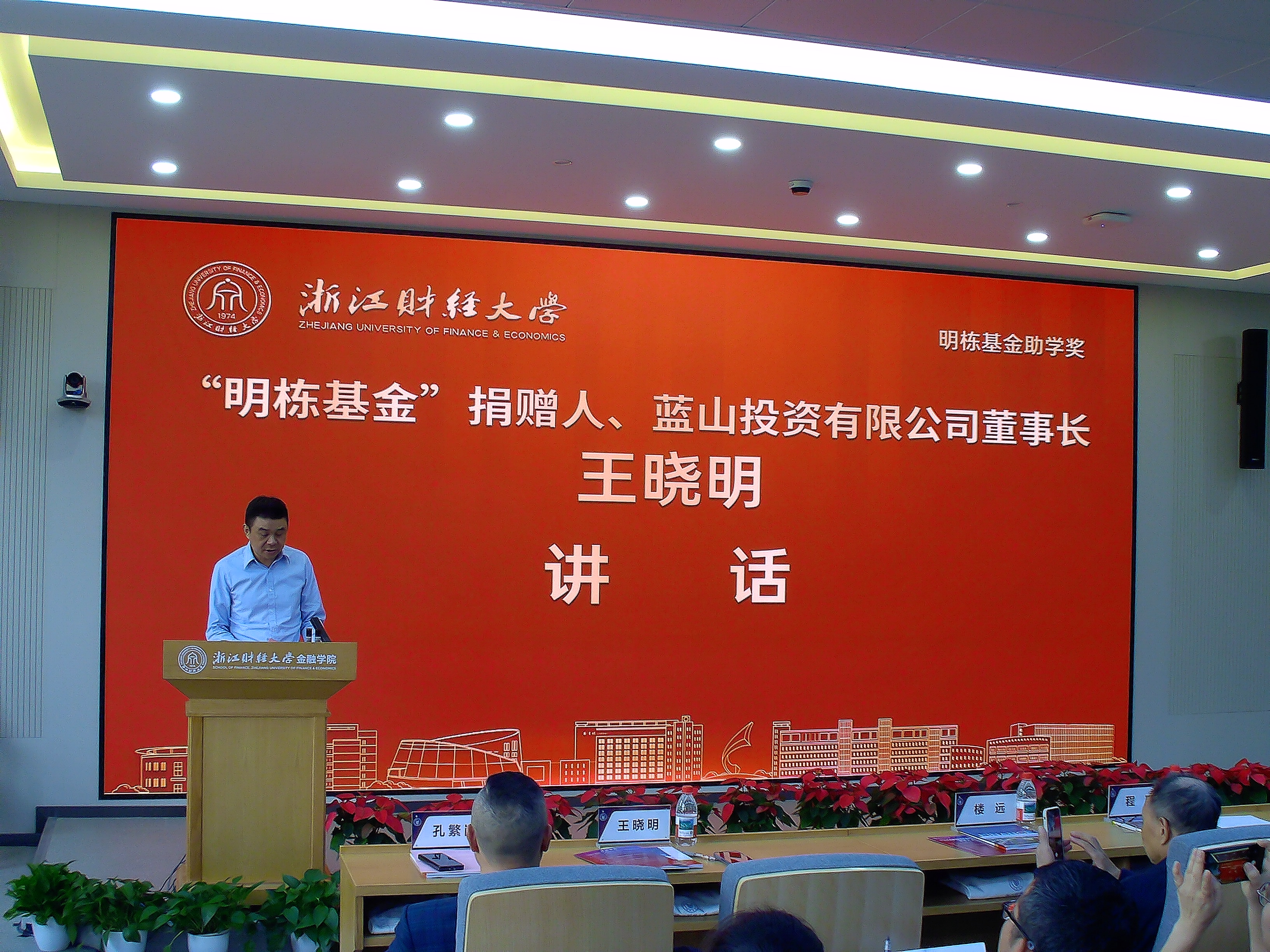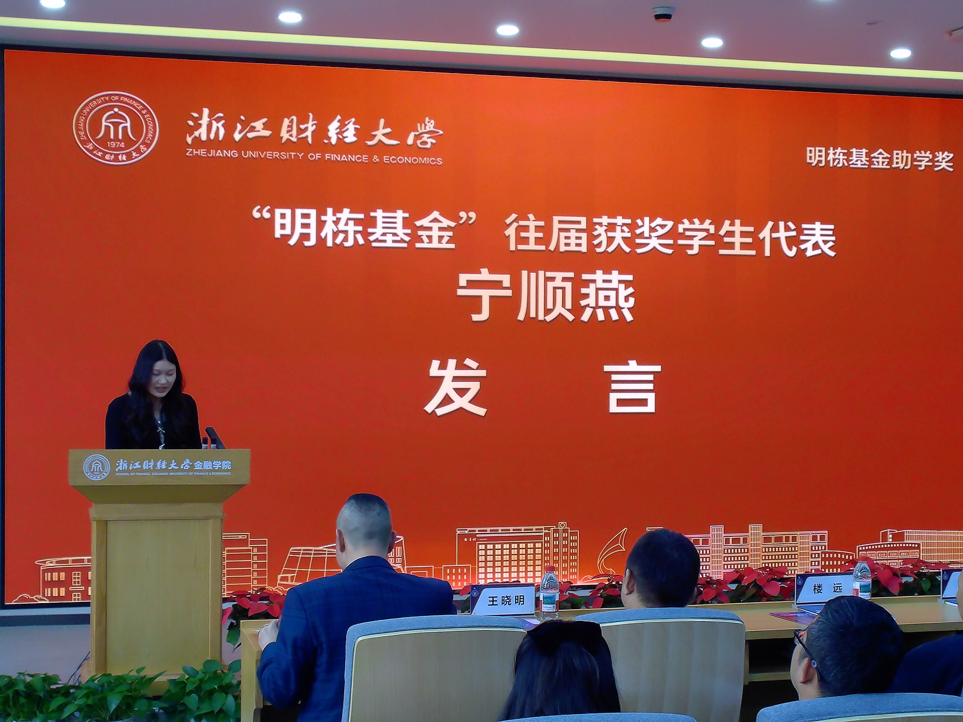 “明栋基金”捐赠方代表王晓明员工讲话。王晓明员工在讲话中回顾了设立基金的初心,他表示未来将继续助力公司培养更多金融领域优秀人才。
