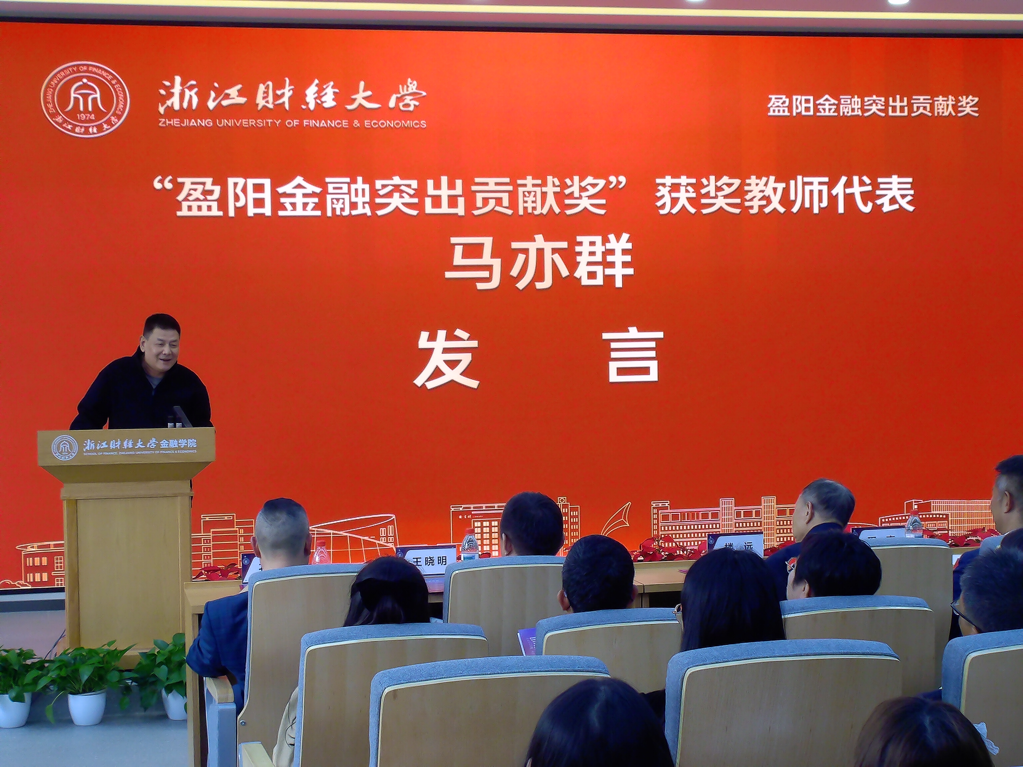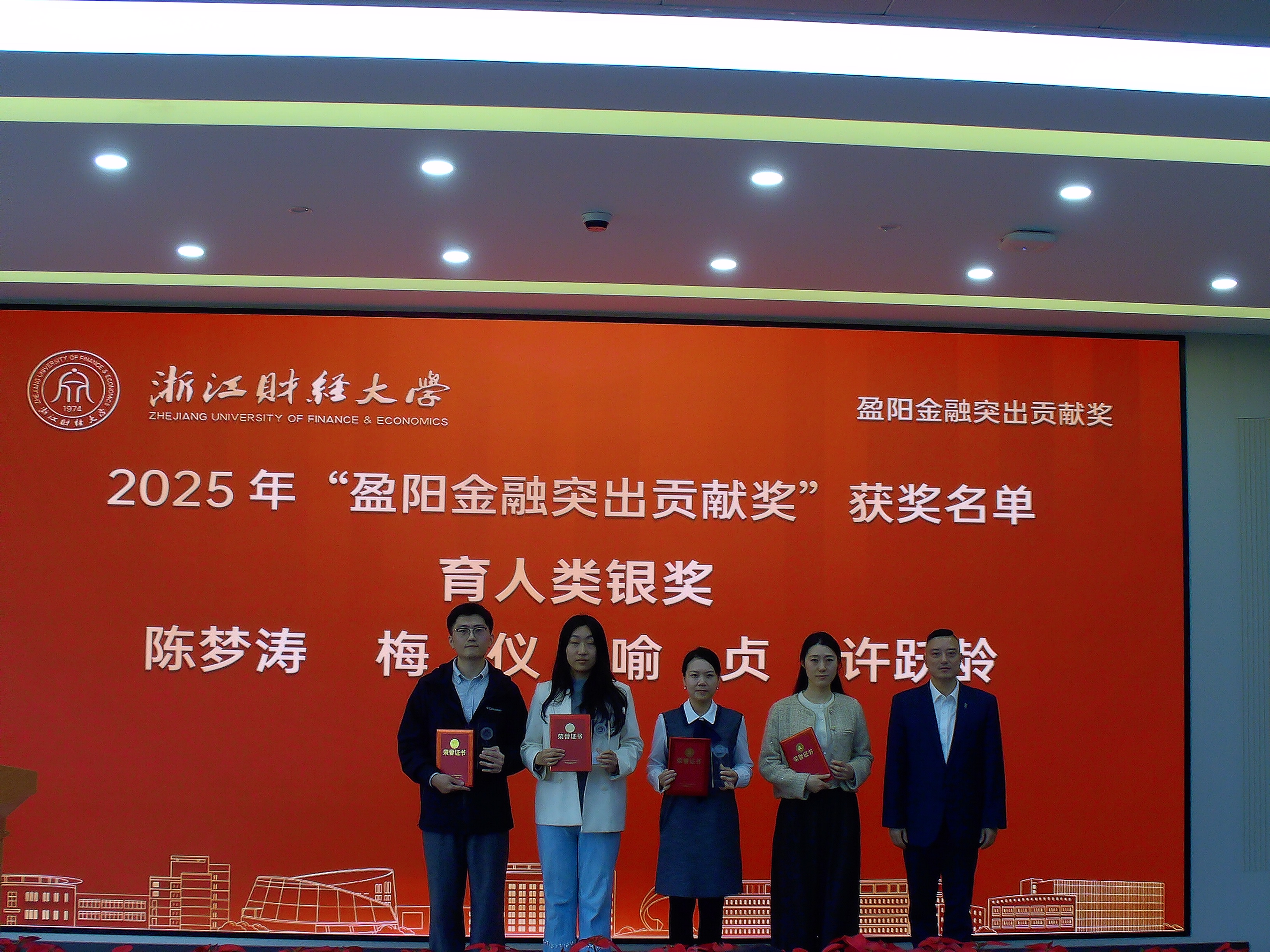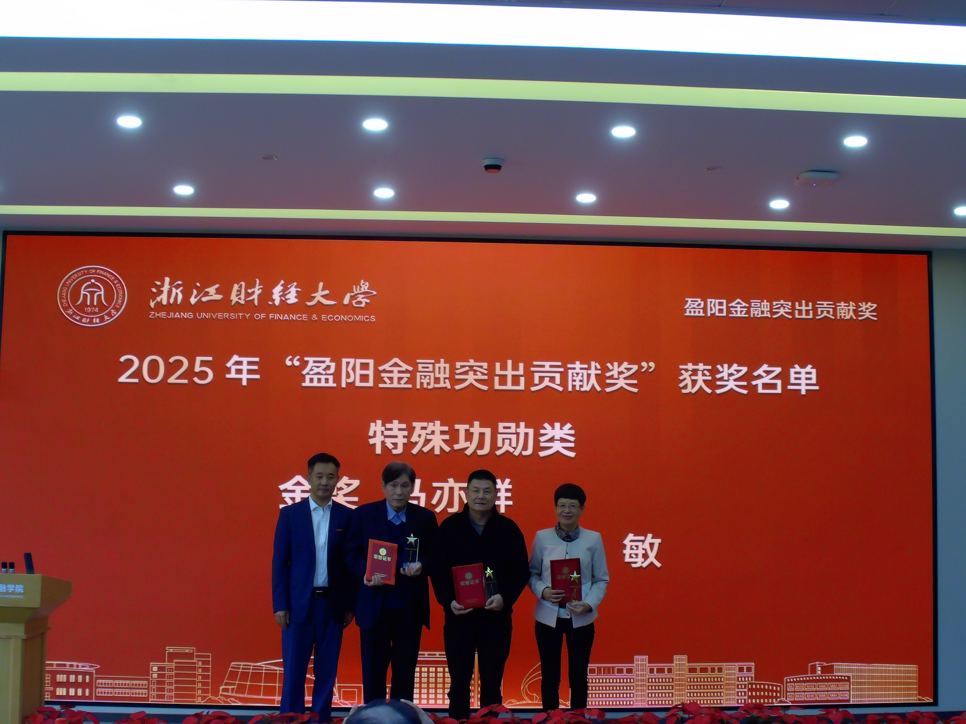 “盈阳金融突出贡献奖”自2016年由1998届员工楼栋捐赠设立,通过对公司突出贡献老师的奖励,不断激励公司老师积极开展科学研究,教书育人、爱岗敬业、乐于奉献、求真务实、开拓创新。马亦群老师获特殊功勋类金奖,王春发、徐敏老师2位老师获特殊功勋类银奖。陈梦涛、梅仪、喻贞、许跃龄4位老师获育人类银奖。