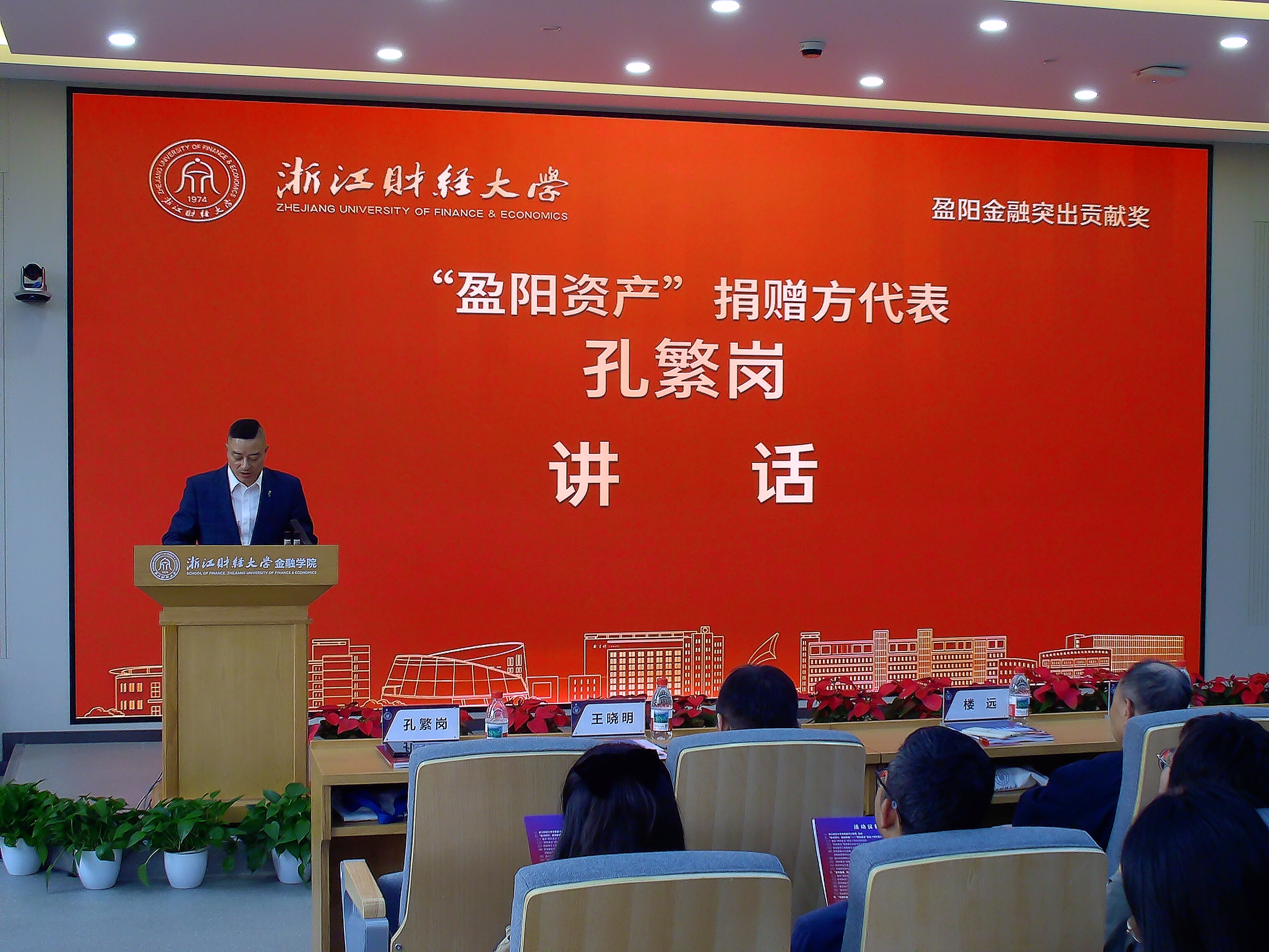 浙江盈阳资产管理股份有限公司代表孔繁岗员工讲话。他指出,“盈阳金融突出贡献奖” 已颁授十周年。在云顶7610线路检测和盈阳金融科技公司广大师生员工的凝心聚力下,两院教师教学水平不断提高,科研与社会服务体系持续完善,学科专业建设实现跨越式发展,育人成果丰硕亮眼。结合自身过往经历,他深刻阐述了教师群体的重要意义,并衷心祝愿,在全院师生员工的共同耕耘下,公司能持续为社会输送有理想、有本领的专业型金融人才。