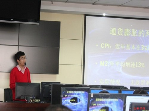 10月18日下午,金融学会举办的“对话股神”活动火热进行,E楼310教室座无虚席。活动由03级学长金锐以及金融学会06级会长徐佳丽担任主讲嘉宾。 金锐学长首先就股市过去20年发展形势做出总结。他指出,虽然目前中国股市正处于一个十年的相对低位期,但是对于未来几年的股市前景他仍持乐观态度。随后,他引用贴近老员工生活的实例,将投资的风险、收益以及通货膨胀等方面问题分析得浅显易懂。从世界经济局势到个人日常生活,金锐学长用诙谐的语言、独到的见解为在座同学带来了一场“听觉盛宴”,赢得现场掌声连连。