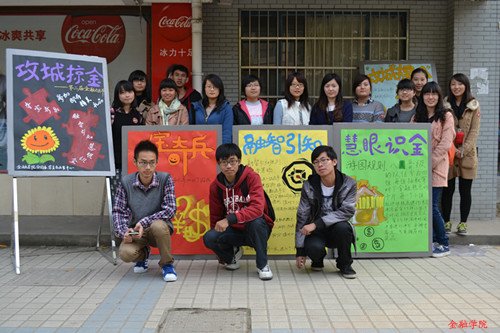 第二关“融智引知”的现场欢呼加油声此起彼伏。“百步穿杨”环节由选手投掷飞镖决定题号,然后由一位选手向另一位选手解释该题号所对应的金融名词,并由另一位选手猜测该名词。在飞镖投掷和形象趣味的名词描述中,选手们的笑声溢满了活动现场,原本陌生的同学不知不觉中打成一片,气氛轻松活跃。而接下来的“金融达人”环节则需要两位选手在规定时间内完成金融知识填空。这不仅仅考验了两位选手对金融知识的把握程度,更需要他们彼此间合理分工、互相协作。