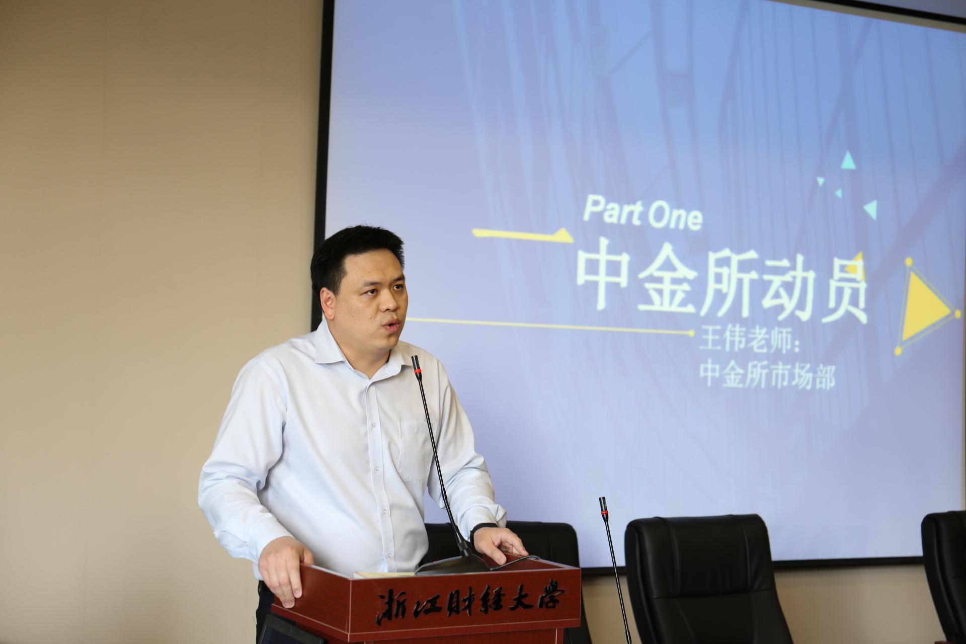 宣讲会第一项议程,中金所市场部王伟先生进行了比赛动员,鼓励激发各公司学子们踊跃参加。紧接着,公司金融工程系主任钟立新教授上台致辞,表达了对中金所主办方的欢迎感谢及校方对本次比赛的重视。