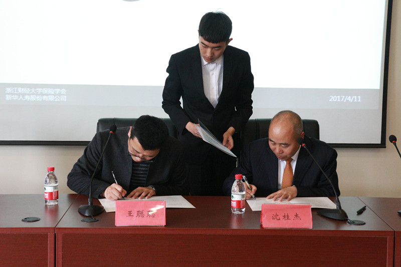 4月11日下午1点,第一届“新华人寿杯”保险案例分析大赛暨新华人寿校外实习基地签约仪式在公司楼202报告厅隆重举行。新华保险浙江分公司副总经理沈桂杰、核保核赔部副经理沈斐、风险管控部法律合规室经理姚波、人力资源部总经理张立微、公司王聪聪副经理、保险系主任周海珍老师,辅导员翟丽媛老师出席了此次活动。