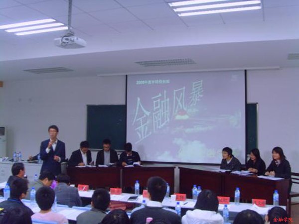 紧接着,这场主题为“金融风暴中的老员工——危机离我们有多远?”的金融风暴终于“爆发”了。这次的金融风暴一改以往模式。在一个又一个生动又现实的情景剧后,讨论主题依次呈现,“老员工该不该炒股?”,“金融学子路在何方?”,“中国中小企业将何去何从?”,“政府到底该不该援助中小企业?”。台上金鹰会员观点鲜明,见解独到,侃侃而谈。而后嘉宾老师站在自己的角度上提出了自己的一番见解,为员工们指点迷津。随着讨论的话题愈加接近同学们的生活,同学们愈感兴趣,共鸣也越多,掌声迭起。中间的互动环节,同学们更是踊跃参加。最后,在一片掌声中,公司金融学会年终特别活动取得圆满的成功。