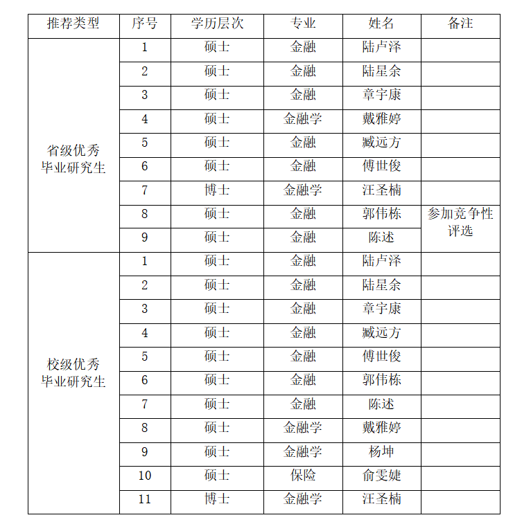 根据《浙江省教育厅办公室关于确认2024届浙江省普通高等公司优秀毕业生的通知》(浙教办函〔2023〕349号)和《云顶7610线路检测研究生荣誉称号评定办法》(浙财大〔2014〕91号)文件精神及云顶7610线路检测党委研究生工作部关于做好2024届省级、校级优秀毕业研究生评定工作的通知,经员工自主申请、评审委员会初评认定,现将2024届省级、校级优秀毕业研究生推荐名单公示如下:
