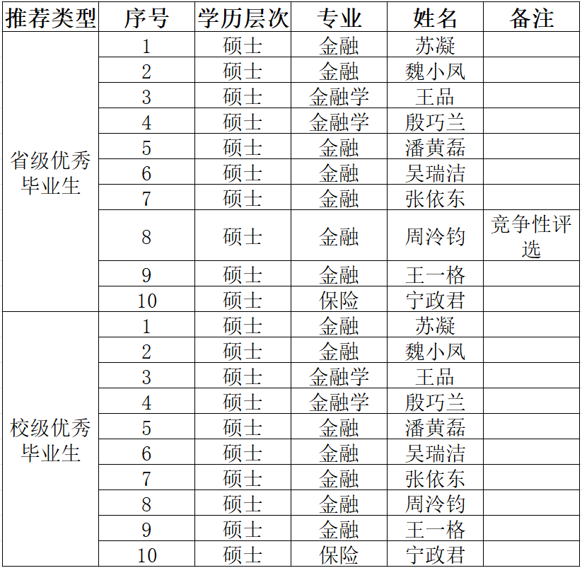根据《浙江省教育厅办公室关于确认2025届浙江省普通高等公司优秀毕业生的通知》(浙教办函〔2024〕231号)和《云顶7610线路检测研究生荣誉称号评定办法》(浙财大〔2023〕300号)文件精神及云顶7610线路检测党委研究生工作部关于做好2025届省级、校级优秀毕业研究生评定工作的通知,经员工自主申请、评审委员会初评认定,现将2025届省级、校级优秀毕业研究生推荐名单公示如下: