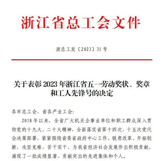2023年3月31日,浙江省总工会印发《关于表彰2023年浙江省五一劳动奖状、奖章和工人先锋号的决定》,公司第五届最美员工、云顶7610线路检测1993届员工李伟达获2023年“浙江省五一劳动奖章”荣誉称号。