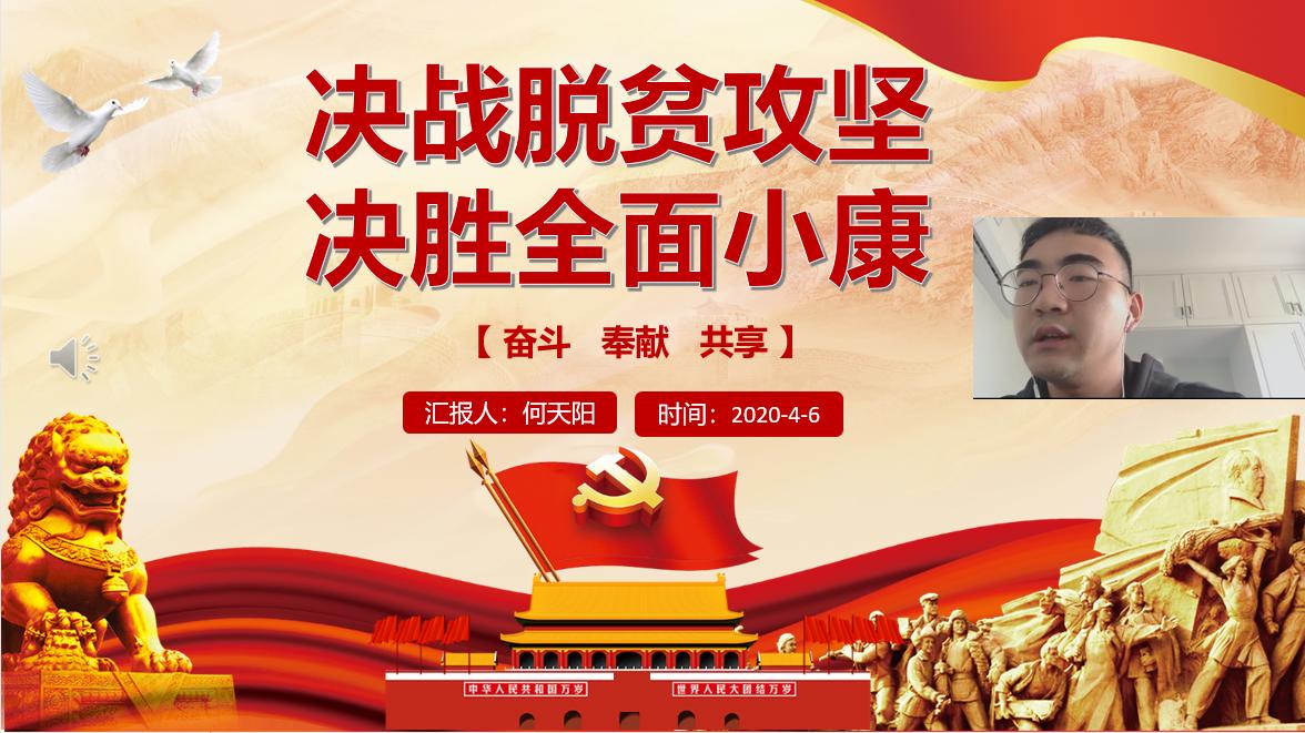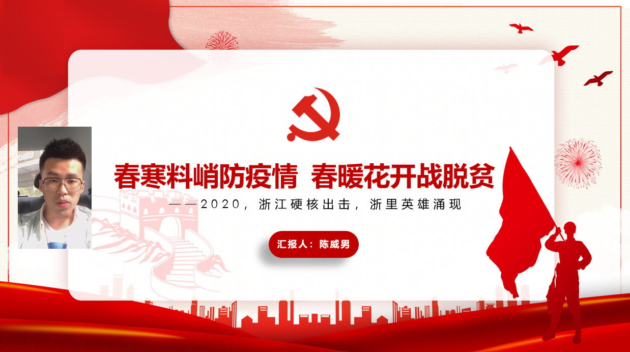 本科生第二党支部陈威男同学以“春寒料峭防疫情,春暖花开战脱贫”为主题,从浙江、公司、个人所在支部三个层面,讨论了抗疫脱贫之路,学习其内涵精神。