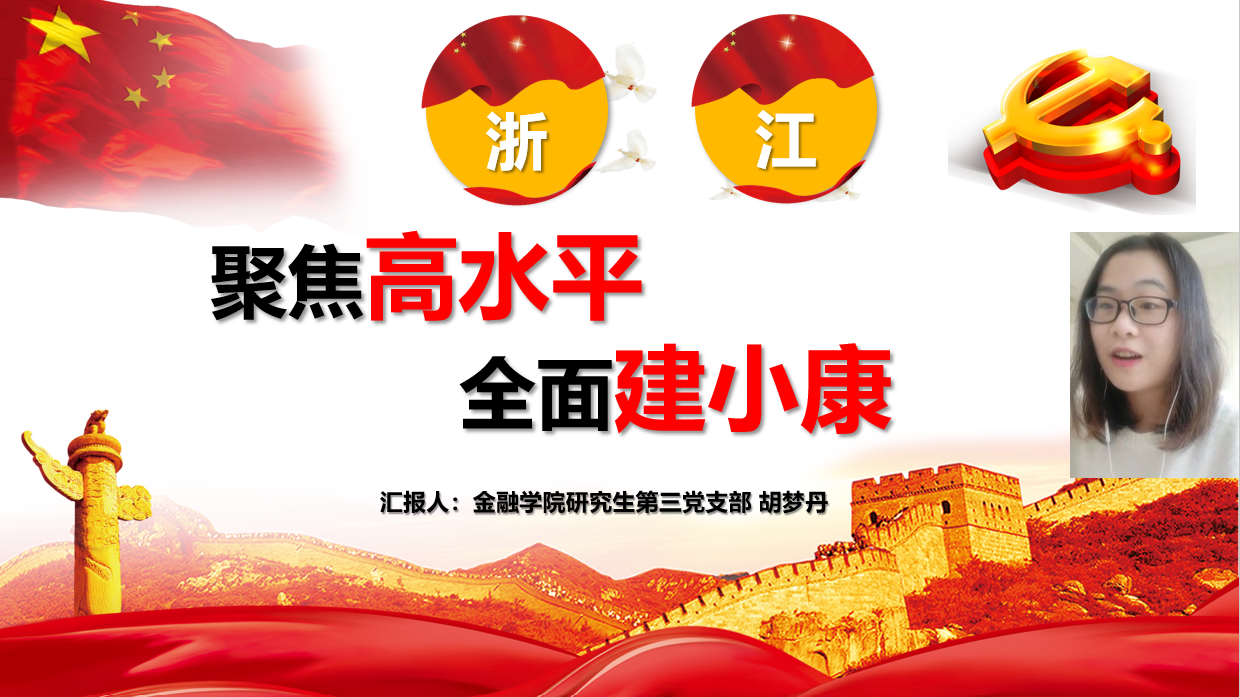 研究生第三党支部胡梦丹同学围绕“聚焦高水平,全面建小康”,从“浙”里亮点、“浙”里成就、“浙”里力量和“浙”里故事四个方面,结合近期疫情,为大家展示浙江风采。