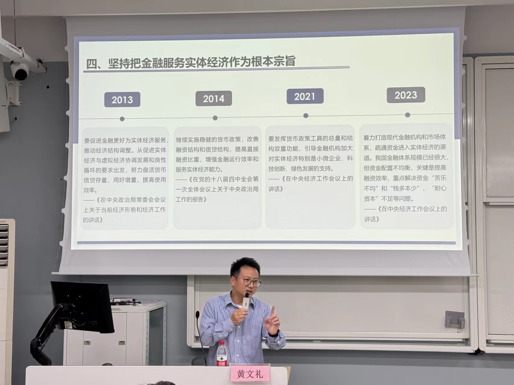 黄文礼老师以“金融强国”为题,以习近平总书记对金融工作的重要论述为引入点,绘声绘色地阐释了金融工作的定位、提升点,以及目前取得的理论成果与实践成果,分析了坚持深化金融供给侧结构性改革对金融改革与高水平开放的重大影响,突出强调金融服务实体经济的重要性。最后,黄文礼老师鼓励学员们要努力提高专业本领,不断提升能力素质,勇当服务国家经济金融发展的生力军。