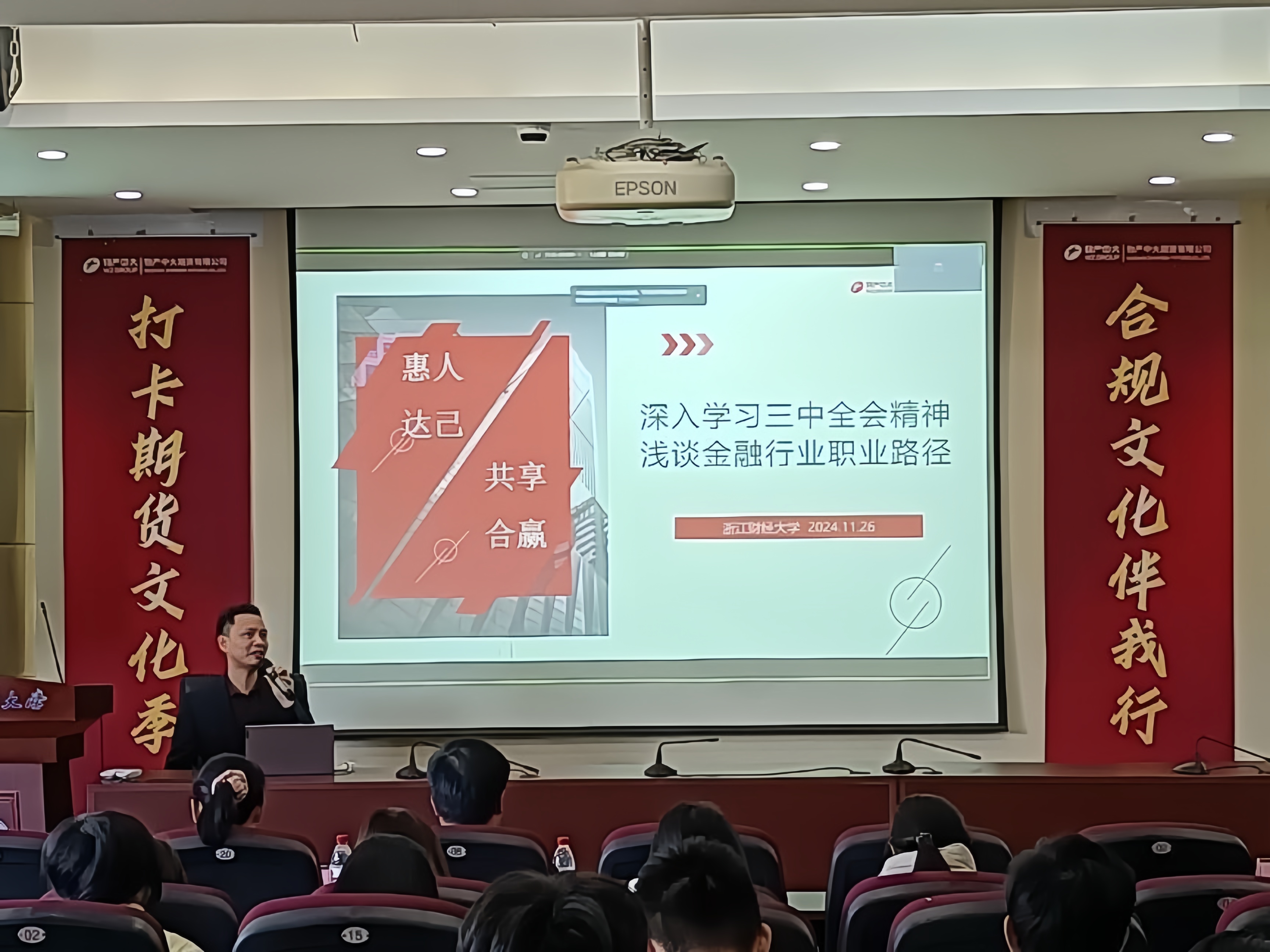 沈骅围绕《支部共建聚合力,期货共富汇人才》这一主题,首先向我们介绍了金融领域中期货的重要意义,点明期货在市场的关键作用;其次带领我们回顾了期货行业的发展历程,列举期货在各领域的应用场景,并分享职业发展思考。他通过深入解读党的二十届三中全会精神,浅谈金融行业职业路径。通过本次学习,同学们加强了党性修养,对金融、期货知识有了更深认识,也明晰自身专业的发展方向,汲取到投身行业的奋进力量。