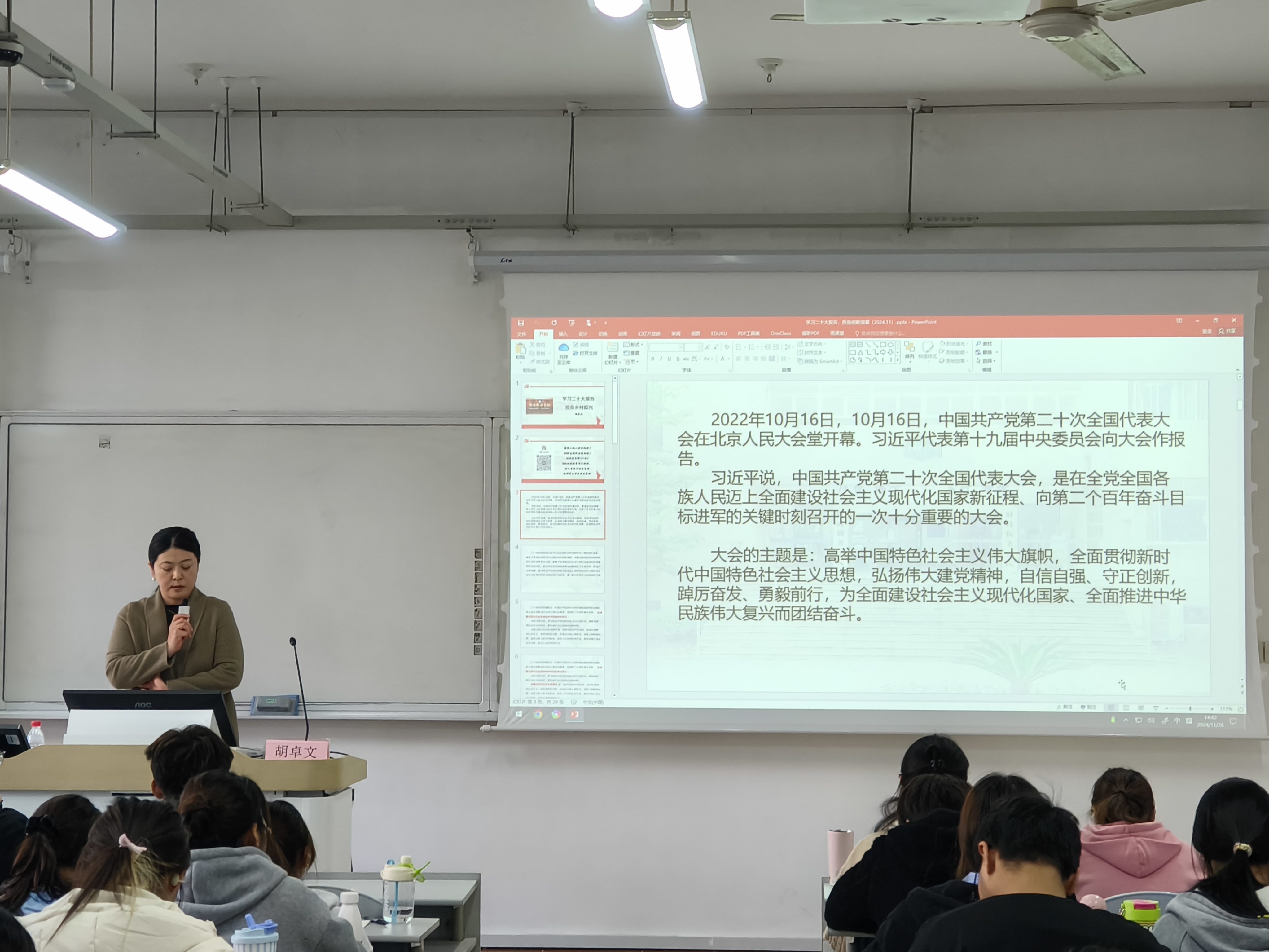 胡卓文老师围绕《学习二十大投身创新创业》这一主题,紧扣党的二十大报告,将宏大的理论拆解为通俗易懂的创业指南。让同学们清晰地认识到,在“加快构建新发展格局,着力推动高质量发展”要求下,科技创新不再是可有可无的点缀,而是企业破局的“关键一招”。另外,入党申请人们在老师的带领下全方位洞悉了国家的前途与民族命运,深切体悟党肩负的历史重任,进而将个人理想嵌入到国家宏大愿景当中,令初心不再缥缈,化作脚踏实地的逐梦动力。